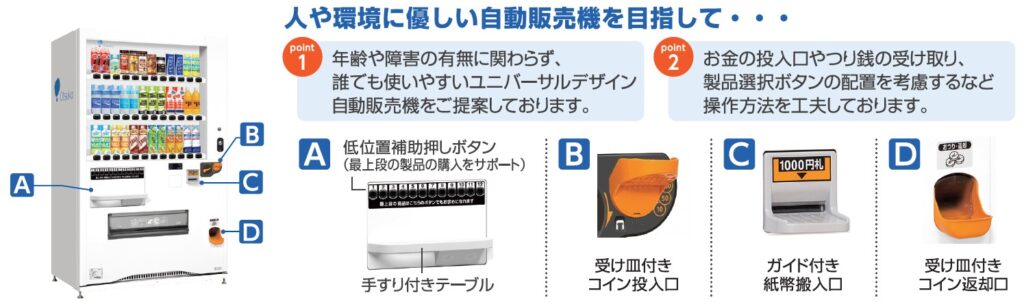 硬貨の投入口や返却口、製品選択ボタンの配置を考慮するなど操作方法を工夫しています。